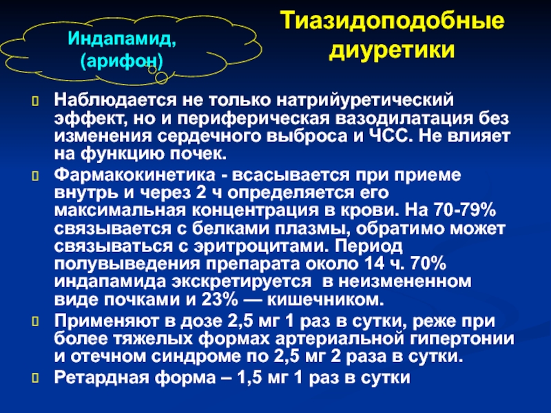 Диуретическое действие препарата наступает через 1-2 ч и продолжается 6-12 ч. Период полувыведения быстрой фазы равен 1,5 ч, а медленной — 13 ч. Продолжительность гипотензивного эффекта составляет 12-18 ч.