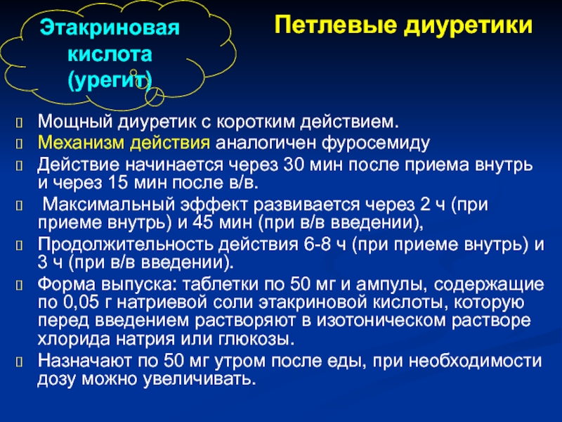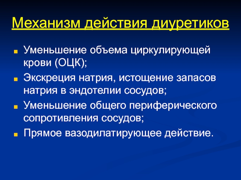 Слайд 13 Механизм действия - увеличивает экскрецию натрия, калия, хлора и