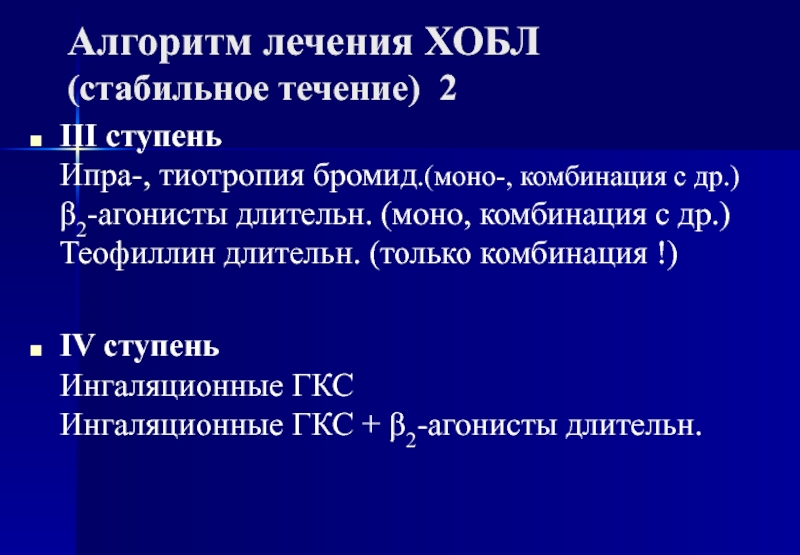 Слайд 55Лечение ХОБЛ III и IV стадии (тяжелое и крайне тяжелое