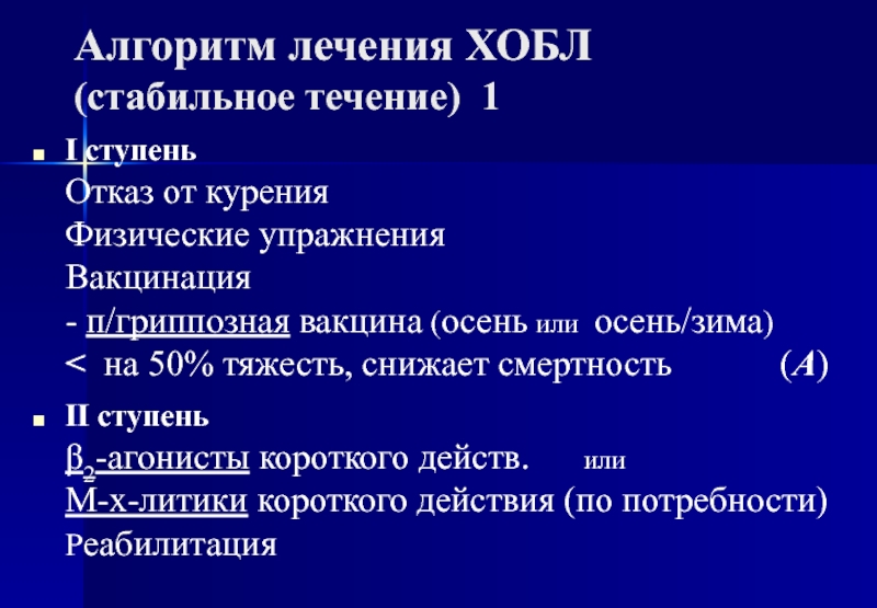 Фармакотерапия - бронхолитики (А) - ГКС (ИГКС ± β2 - агонист или М-х-литик) (А) - вакцины (гриппозная- А, пневмококковая -В) - муколитические средства
