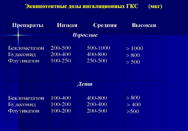 Слайд 13Эквипотентные дозы ингаляционных ГКС (мкг)