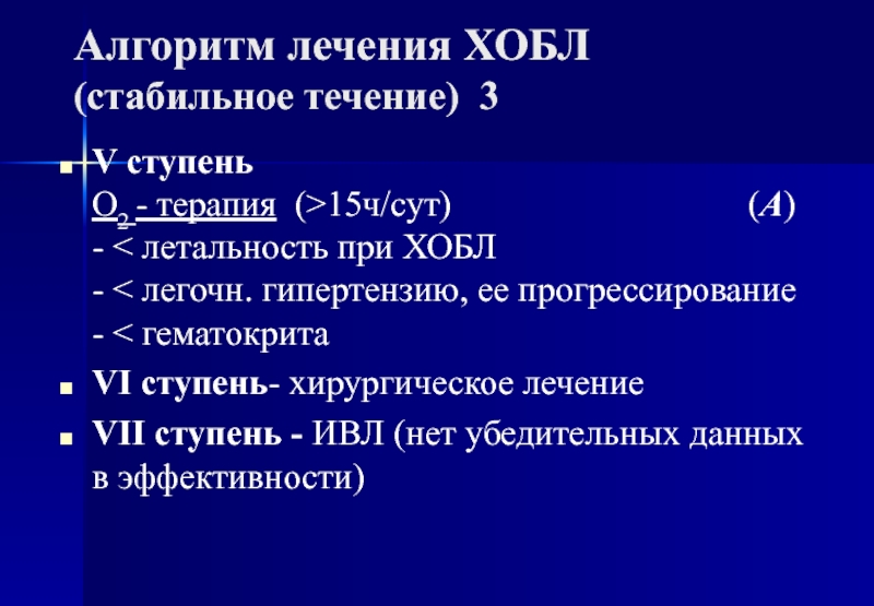 О2 - терапия (>15ч/сут) (А) - < летальность при ХОБЛ - < легочн. гипертензию, ее прогрессирование - < гематокрита