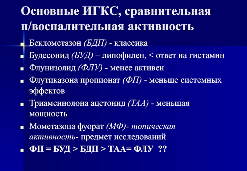 Слайд 12Основные ИГКС, сравнительная п/воспалительная активность