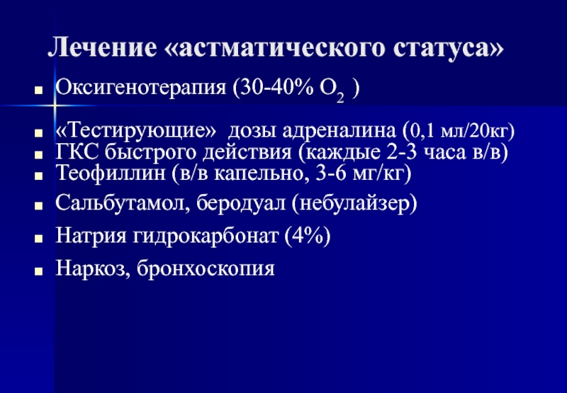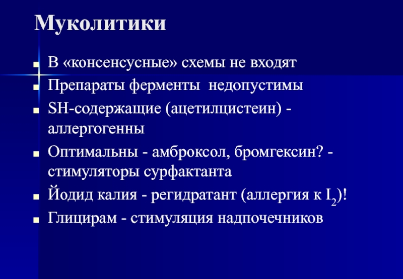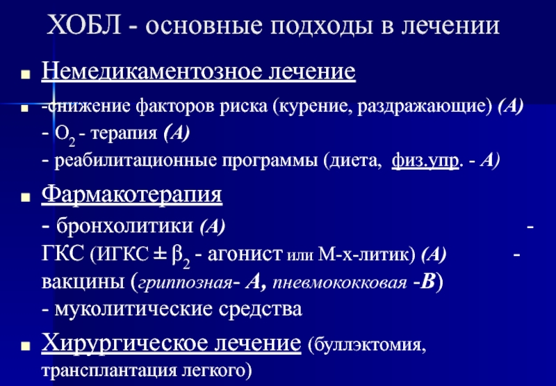 Фармакотерапия - бронхолитики (А) - ГКС (ИГКС ± β2 - агонист или М-х-литик) (А) - вакцины (гриппозная- А, пневмококковая -В) - муколитические средства