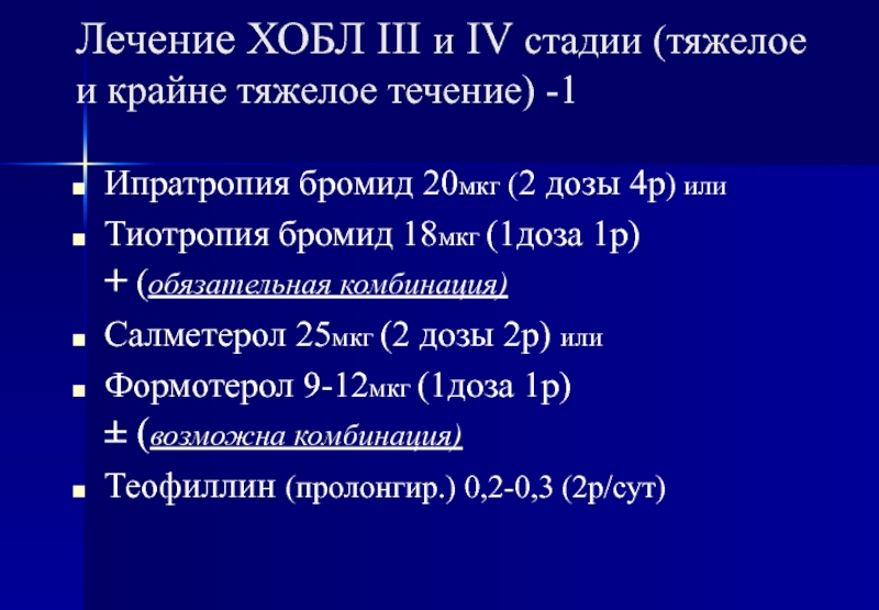 Слайд 55Лечение ХОБЛ III и IV стадии (тяжелое и крайне тяжелое