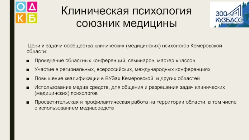 Клиническая психология  союзник медицины Цели и задачи сообщества клинических (медицинских) психологов Кемеровской области:Проведение областных конференций, семинаров,