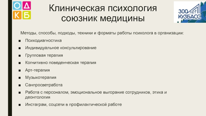 Клиническая психология  союзник медицины Методы, способы, подходы, техники и форматы работы психолога в организации:ПсиходиагностикаИндивидуальное консультированиеГрупповая терапияКогнитивно