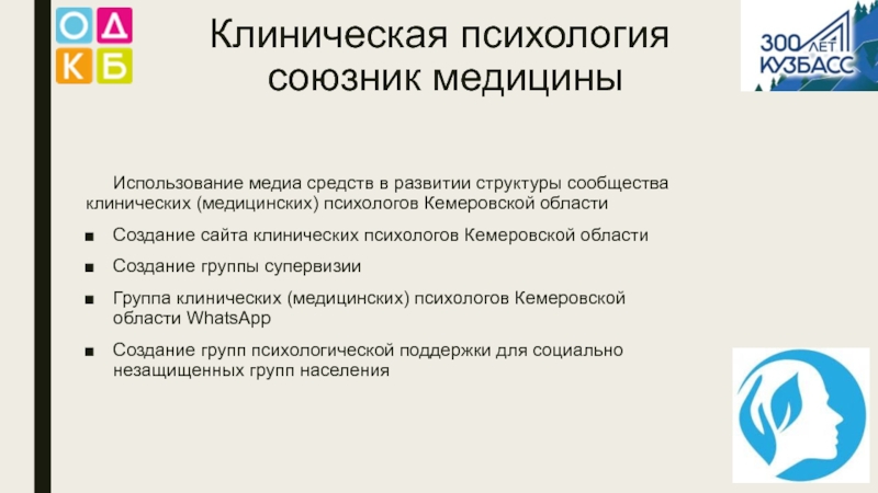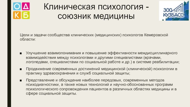 Клиническая психология -  союзник медициныЦели и задачи сообщества клинических (медицинских) психологов Кемеровской области: Улучшение взаимопонимания и