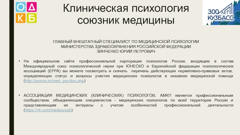 Клиническая психология  союзник медициныГЛАВНЫЙ ВНЕШТАТНЫЙ СПЕЦИАЛИСТ ПО МЕДИЦИНСКОЙ ПСИХОЛОГИИМИНИСТЕРСТВА ЗДРАВООХРАНЕНИЯ РОССИЙСКОЙ ФЕДЕРАЦИИ ЗИНЧЕНКО ЮРИЙ ПЕТРОВИЧНа официальном