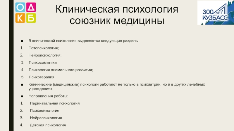 Клиническая психология  союзник медициныВ клинической психологии выделяются следующие разделы:Патопсихология;Нейропсихология;3.  Психосоматика;4.  Психология аномального развития;5.