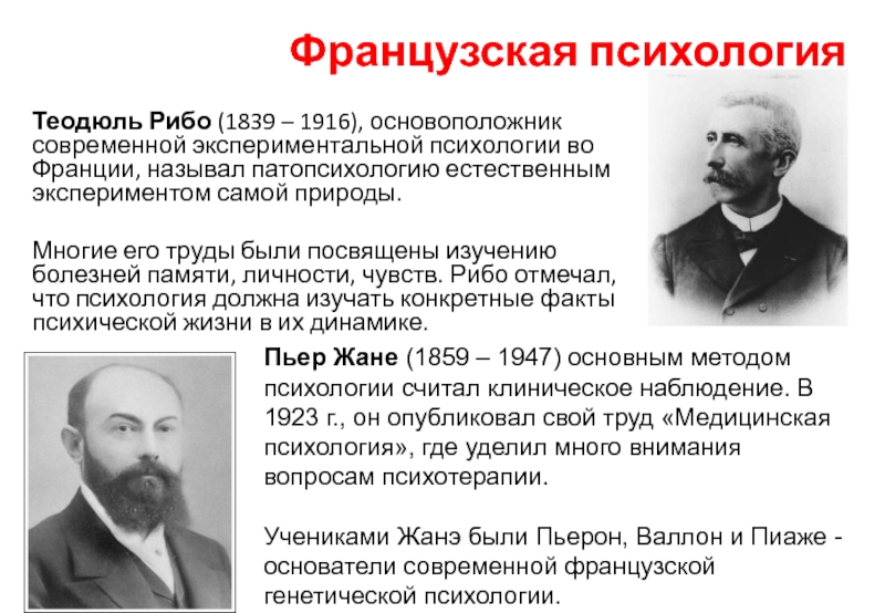 Учениками Жанэ были Пьерон, Валлон и Пиаже - основатели современной французской генетической психологии.