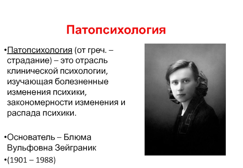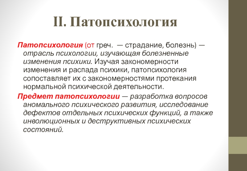 Патопсихология (от греч. – страдание) – это отрасль клинической психологии, изучающая болезненные изменения психики, закономерности изменения и распада психики.