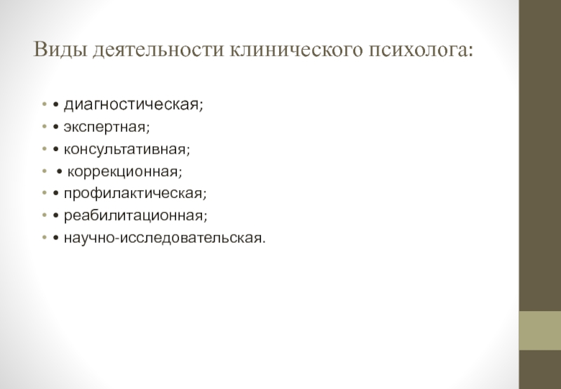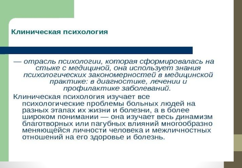 Слайд 9 Клиническая психология – это часть психологической науки, которая использует