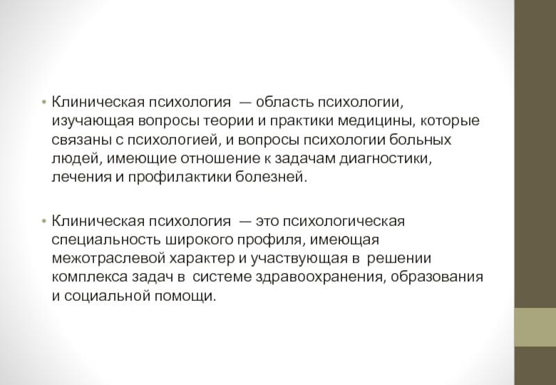Клиническая психология — это психологическая специальность широкого профиля, имеющая межотраслевой характер и участвующая в решении комплекса задач в системе здравоохранения, образования и социальной помощи.