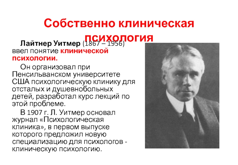 В 1907 г. Л. Уитмер основал журнал «Психологическая клиника», в первом выпуске которого предложил новую специализацию для психологов - клиническую психологию.