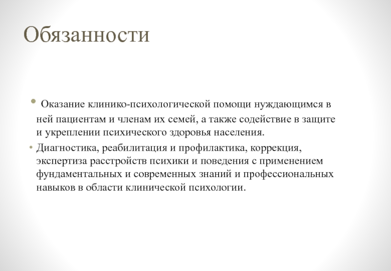 Должностные обязанности. Проводит работу, направленную на восстановление психического здоровья и коррекцию отклонений в развитии личности больных. Выявляет условия, препятствующие или затрудняющие гармоническое развитие личности больного.
