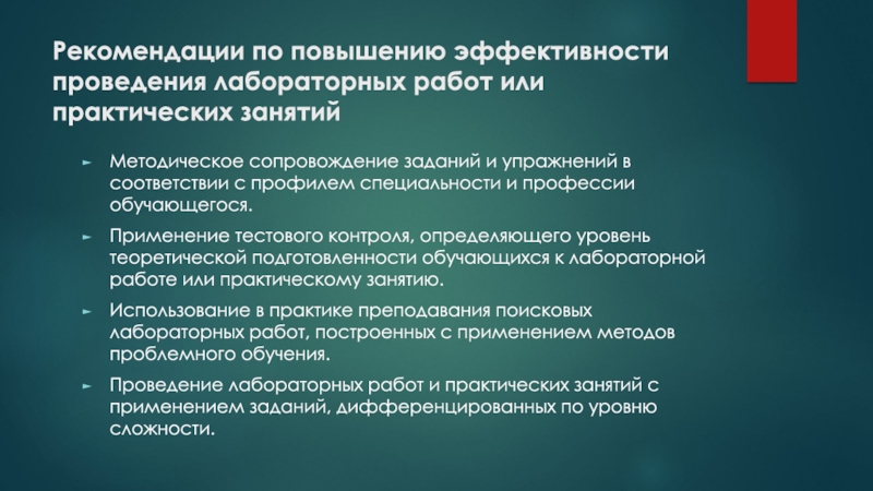 Слайд 16Рекомендации по повышению эффективности проведения лабораторных работ или практических занятий