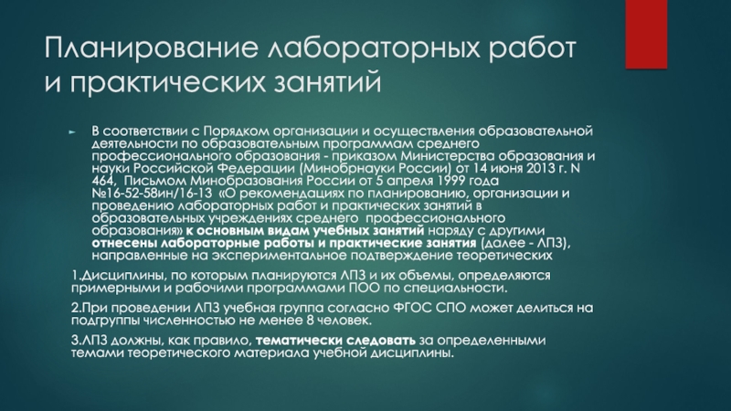 - приказом Министерства образования и науки Российской Федерации (Минобрнауки России) от 14 июня 2013 г. N 464, Письмом Минобразования России от 5 апреля 1999 года №16-52-58ин/16-13 «О рекомендациях по планированию, организации и проведению лабораторных работ и практических занятий в образовательных учреждениях среднего профессионального образования» к основным видам учебных занятий наряду с другими отнесены лабораторные работы и практические занятия (далее - ЛПЗ), направленные на экспериментальное подтверждение теоретических