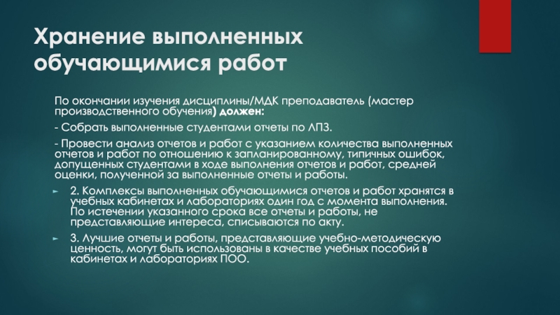 2. Комплексы выполненных обучающимися отчетов и работ хранятся в учебных кабинетах и лабораториях один год с момента выполнения. По истечении указанного срока все отчеты и работы, не представляющие интереса, списываются по акту.