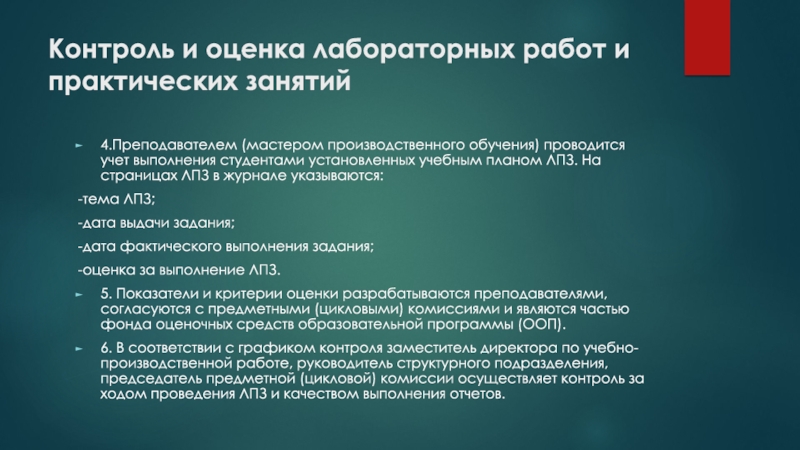 6. В соответствии с графиком контроля заместитель директора по учебно- производственной работе, руководитель структурного подразделения, председатель предметной (цикловой) комиссии осуществляет контроль за ходом проведения ЛПЗ и качеством выполнения отчетов.