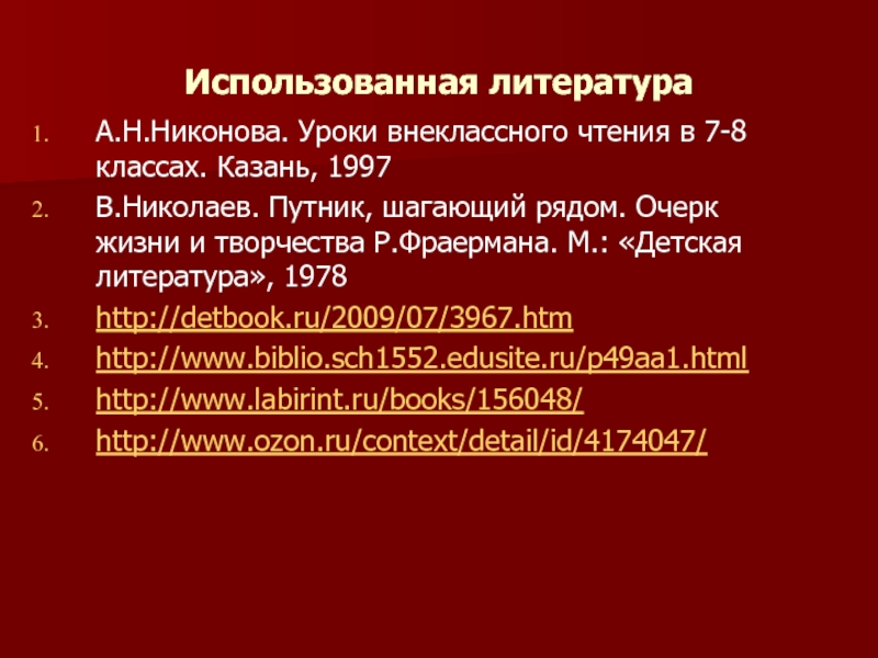 Использованная литератураА.Н.Никонова. Уроки внеклассного чтения в 7-8 классах. Казань, 1997 В.Николаев. Путник, шагающий рядом. Очерк жизни и