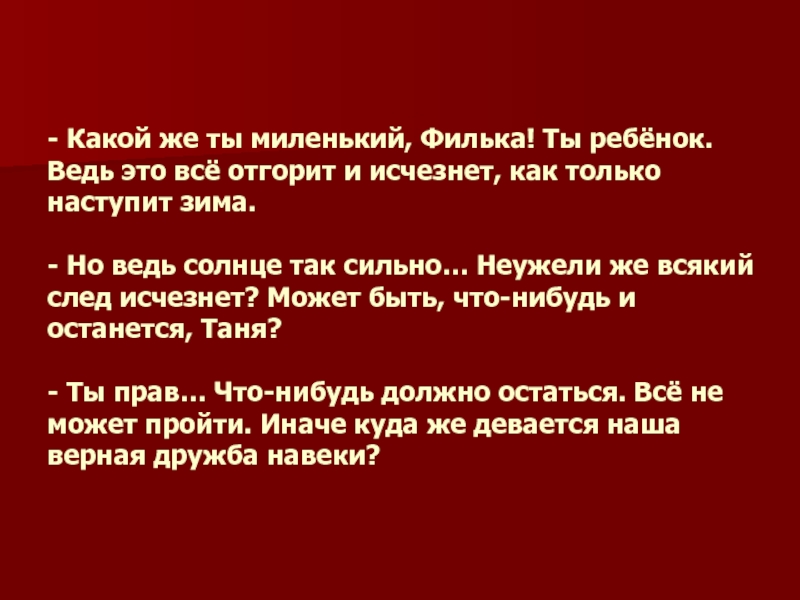 солнце так сильно… Неужели же всякий след исчезнет? Может быть, что-нибудь и останется, Таня? - Ты прав… Что-нибудь должно остаться. Всё не может пройти. Иначе куда же девается наша верная дружба навеки?