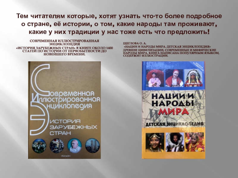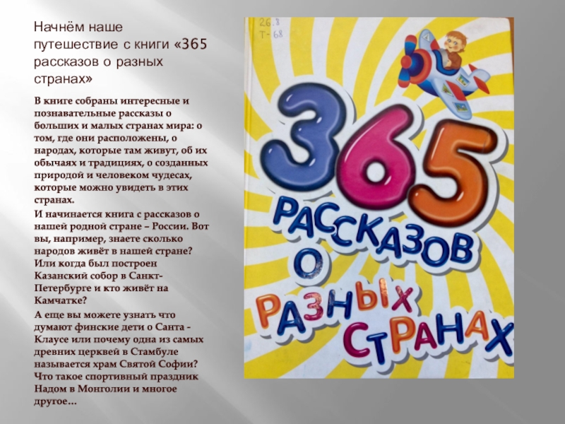 странах мира: о том, где они расположены, о народах, которые там живут, об их обычаях и традициях, о созданных природой и человеком чудесах, которые можно увидеть в этих странах.И начинается книга с рассказов о нашей родной стране – России. Вот вы, например, знаете сколько народов живёт в нашей стране? Или когда был построен Казанский собор в Санкт-Петербурге и кто живёт на Камчатке?