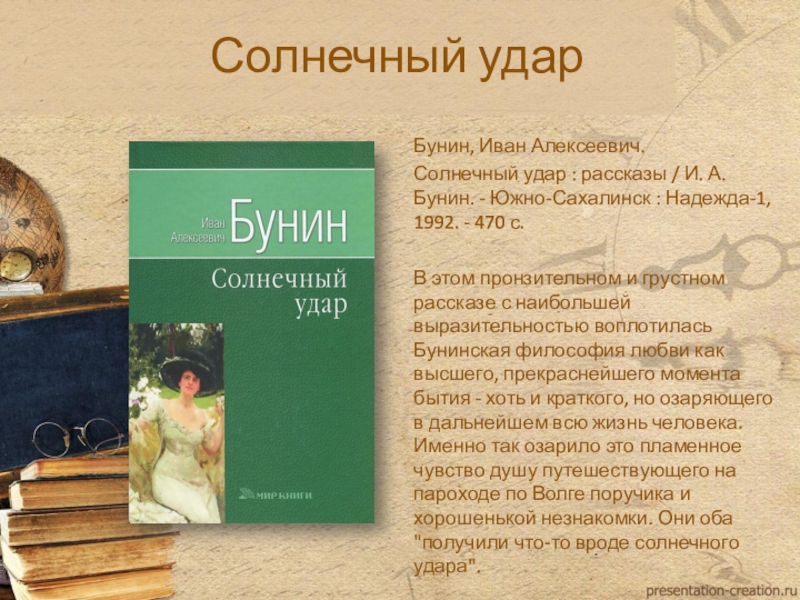 этом пронзительном и грустном рассказе с наибольшей выразительностью воплотилась Бунинская философия любви как высшего, прекраснейшего момента бытия - хоть и краткого, но озаряющего в дальнейшем всю жизнь человека. Именно так озарило это пламенное чувство душу путешествующего на пароходе по Волге поручика и хорошенькой незнакомки. Они оба "получили что-то вроде солнечного удара".