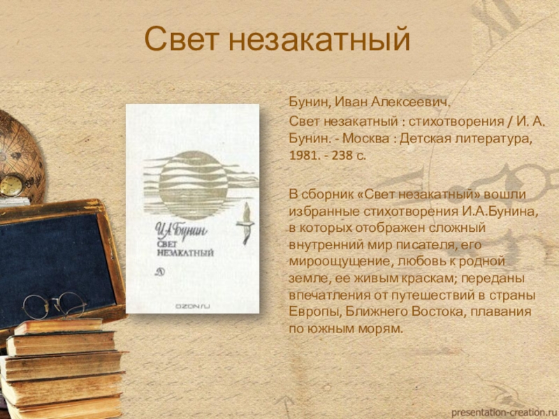 В сборник «Свет незакатный» вошли избранные стихотворения И.А.Бунина, в которых отображен сложный внутренний мир писателя, его мироощущение, любовь к родной земле, ее живым краскам; переданы впечатления от путешествий в страны Европы, Ближнего Востока, плавания по южным морям.