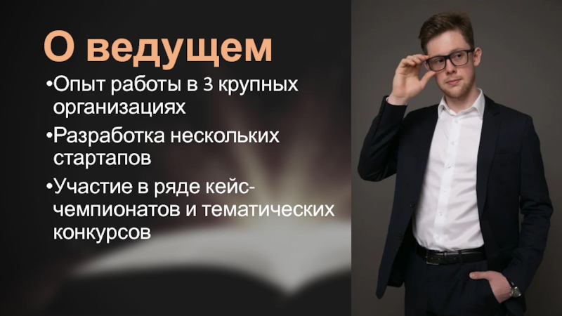 О ведущемОпыт работы в 3 крупных организацияхРазработка нескольких стартаповУчастие в ряде кейс-чемпионатов и тематических конкурсов