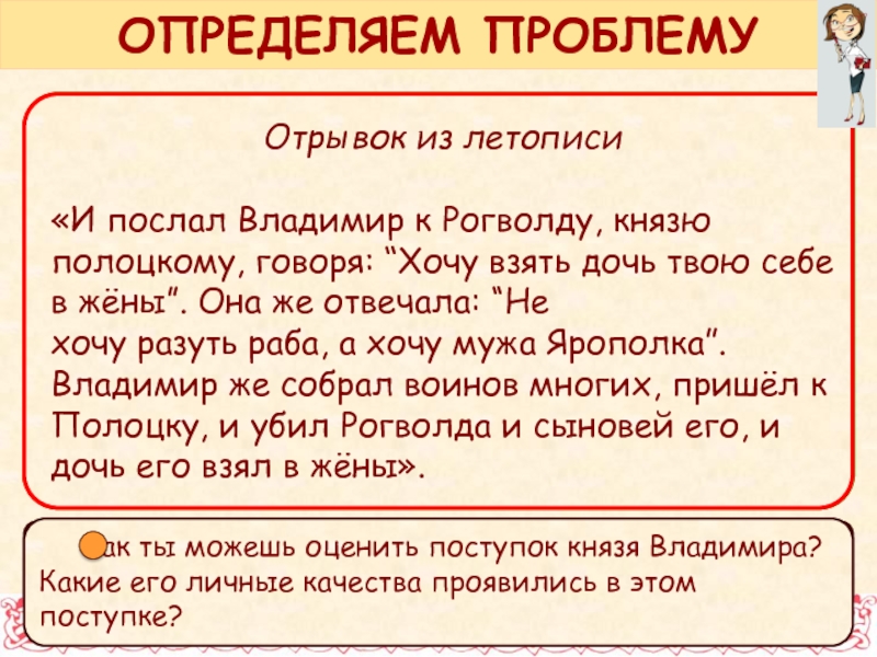 "Не хочу разуть раба, а хочу мужа Ярополка". Владимир же собрал воинов многих, пришёл к Полоцку, и убил Рогволда и сыновей его, и дочь его взял в жёны».Справочные сведения