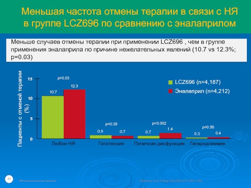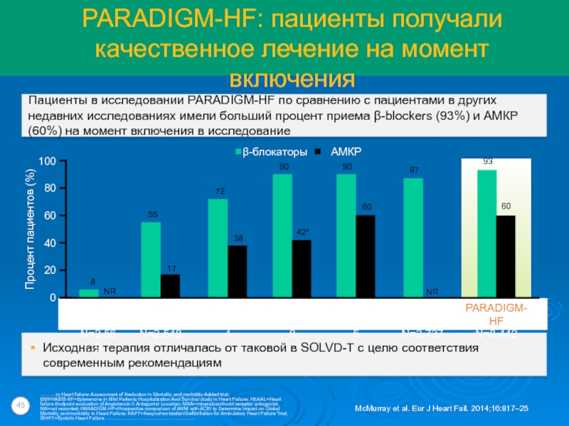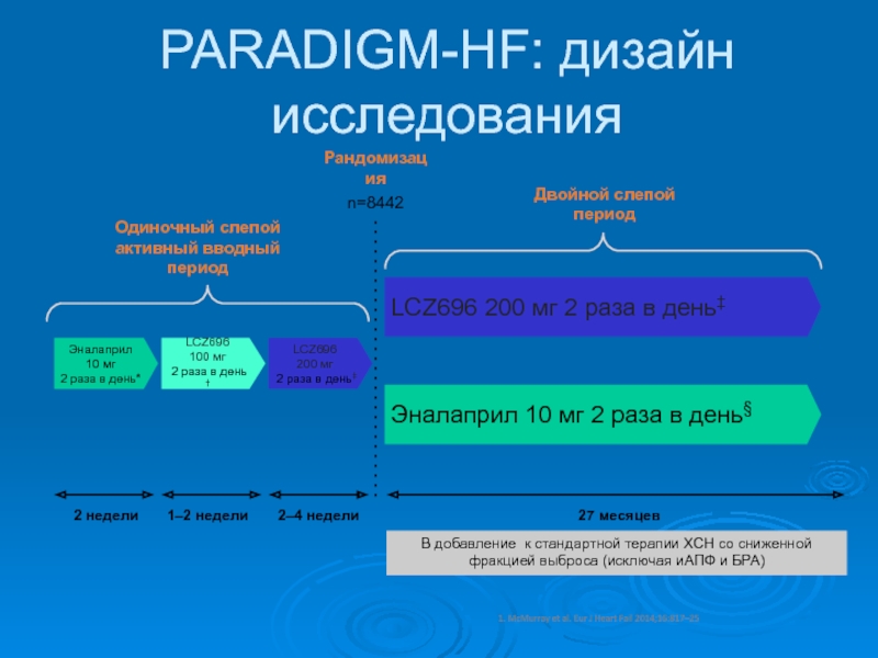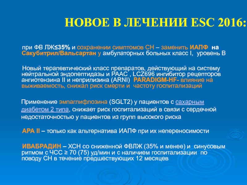 Новый терапевтический класс препаратов, действующий на систему нейтральной эндопептидазы и РААС , LCZ696 ингибитор рецепторов ангиотензина II и неприлизина (ARNI) PARADIGM-HF- влияние на выживаемость, снижал риск смерти и частоту госпитализаций