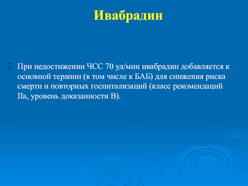 ИВАБРАДИН – ХСН со сниженной ФВЛЖ (35% и менее) и синусовым ритмом с ЧСС ≥ 70 (75) уд/мин и с наличием госпитализации по поводу СН в течение предшествующих 12 месяцев