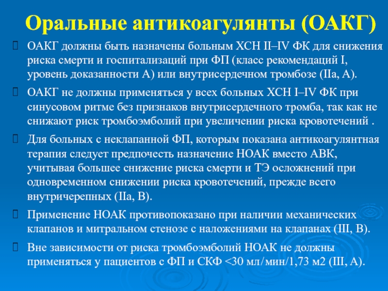 ОАКГ не должны применяться у всех больных ХСН I–IV ФК при синусовом ритме без признаков внутрисердечного тромба, так как не снижают риск тромбоэмболий при увеличении риска кровотечений .