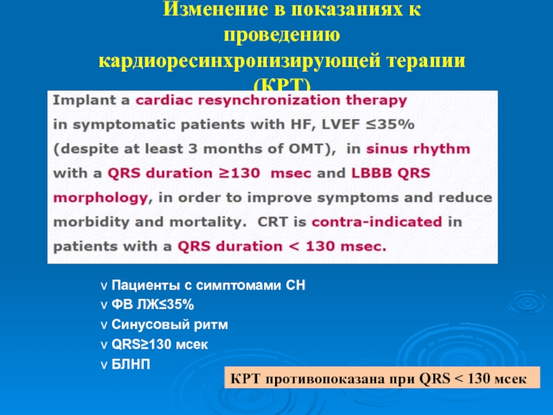 Слайд 72Изменение в показаниях к проведению кардиоресинхронизирующей терапии (КРТ)