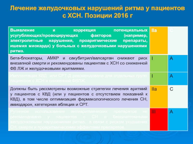 Слайд 71Лечение желудочковых нарушений ритма у пациентов с ХСН. Позиции 2016