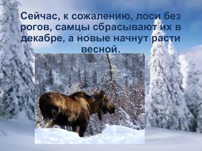 Слайд 24Сейчас, к сожалению, лоси без рогов, самцы сбрасывают их в
