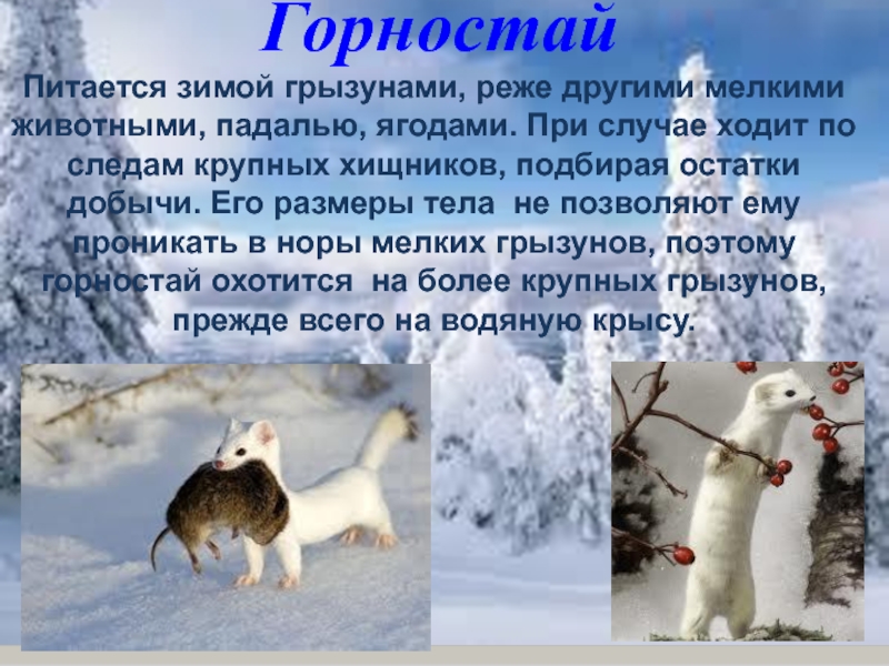 размеры тела не позволяют ему проникать в норы мелких грызунов, поэтому горностай охотится на более крупных грызунов, прежде всего на водяную крысу.