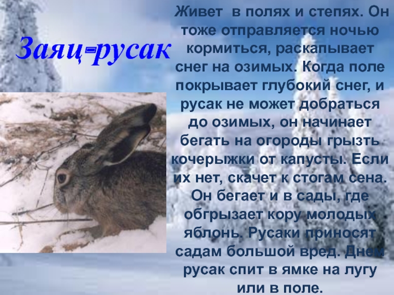 русак не может добраться до озимых, он начинает бегать на огороды грызть кочерыжки от капусты. Если их нет, скачет к стогам сена. Он бегает и в сады, где обгрызает кору молодых яблонь. Русаки приносят садам большой вред. Днем русак спит в ямке на лугу или в поле.