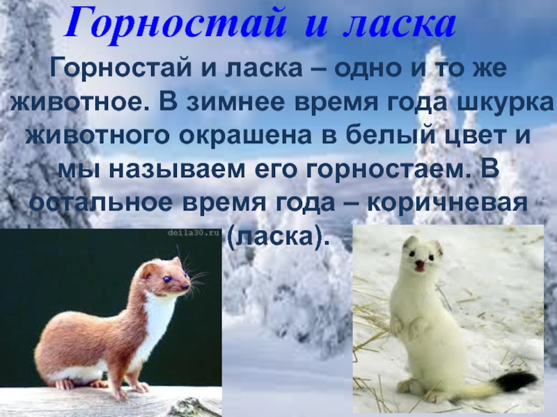 цвет и мы называем его горностаем. В остальное время года – коричневая (ласка).