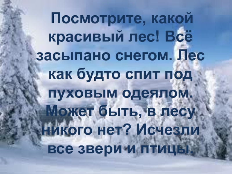 Слайд 3 Посмотрите, какой красивый лес! Всё засыпано снегом. Лес как