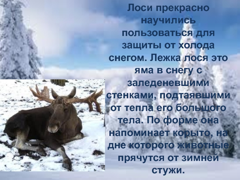 Слайд 23Лоси прекрасно научились пользоваться для защиты от холода снегом. Лежка