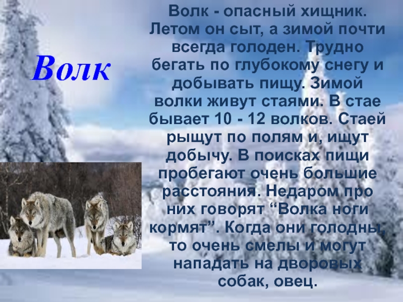 Зимой волки живут стаями. В стае бывает 10 - 12 волков. Стаей рыщут по полям и, ищут добычу. В поисках пищи пробегают очень большие расстояния. Недаром про них говорят “Волка ноги кормят”. Когда они голодны, то очень смелы и могут нападать на дворовых собак, овец.