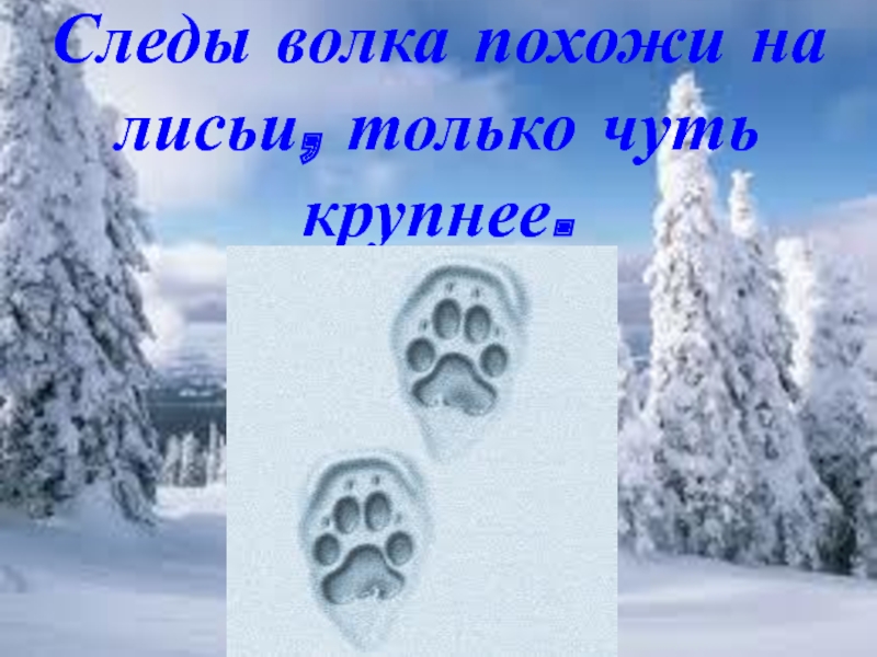 Слайд 30Следы волка похожи на лисьи, только чуть крупнее.
