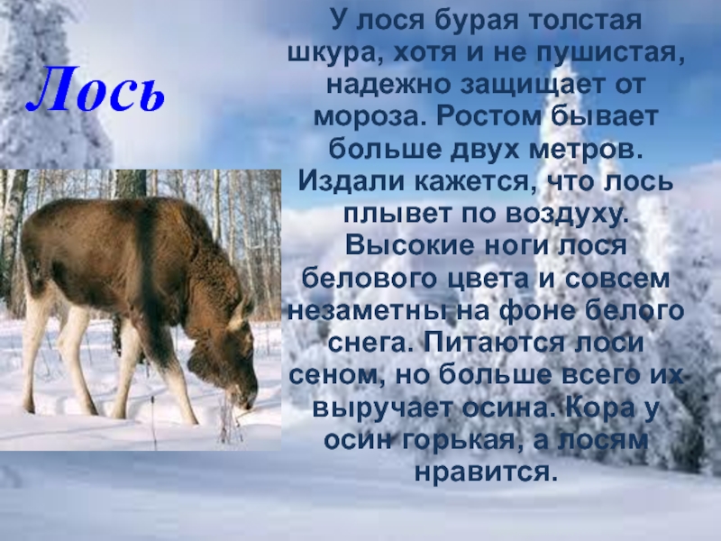 что лось плывет по воздуху. Высокие ноги лося белового цвета и совсем незаметны на фоне белого снега. Питаются лоси сеном, но больше всего их выручает осина. Кора у осин горькая, а лосям нравится.