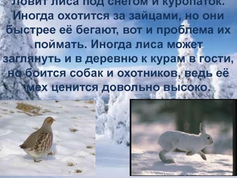 Слайд 8Ловит лиса под снегом и куропаток. Иногда охотится за зайцами,