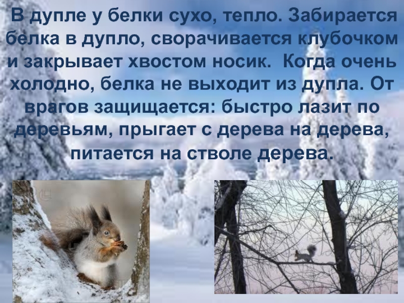 Слайд 39 В дупле у белки сухо, тепло. Забирается белка в дупло,