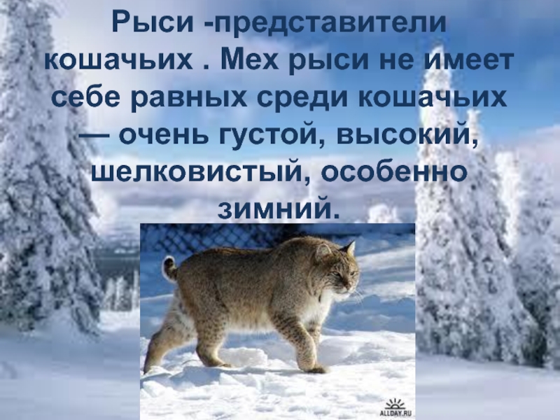 Слайд 28Рыси -представители кошачьих . Мех рыси не имеет себе равных среди кошачьих