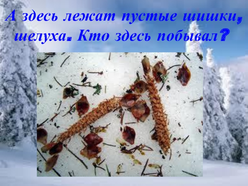 Слайд 35А здесь лежат пустые шишки, шелуха. Кто здесь побывал?