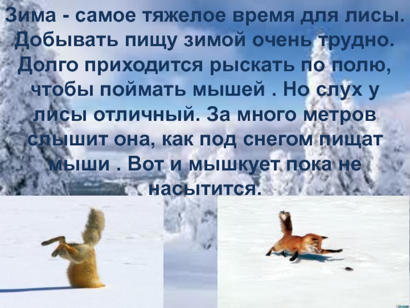 Слайд 7Зима - самое тяжелое время для лисы. Добывать пищу зимой